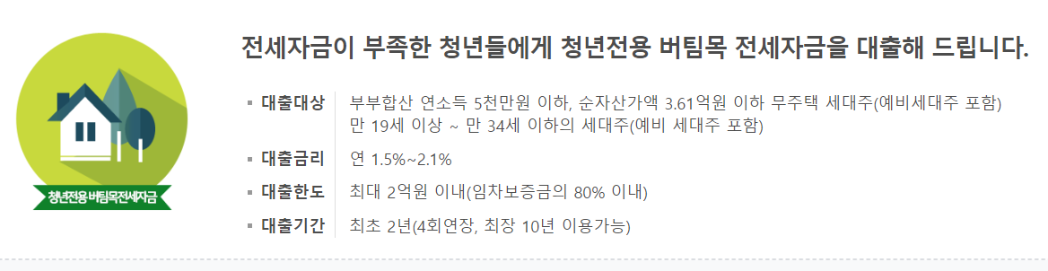 저금리로 대출받을 수 있도록 지원해주는 상품으로서 요건이 맞는다면 대출금리 연 1.5% ~2.1%의 저리로 전세대출을